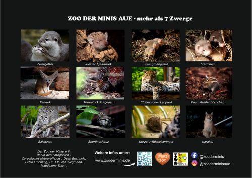 Mehr als 400 tierische Minis, darunter alle weltweit kleinsten Haustierrassen und viele sehr seltene Miniformen aus der Wildnis machen den Besuch im zoo der minis Aue zu einem ganz besonderem Erlebnis. Und damit sich auch die menschlichen Zwerge wohl fühlen, gibt es einen Spielplatz, Streichelgehege und die Möglichkeit nach Voranmeldung den Kindergeburtstag im Zoo zu feiern.